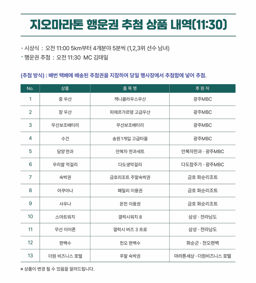 지오마라톤 행사 당일 행운권 추첨 상품 안내